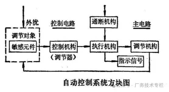 由于外扰的作用,调节对象的调节参数发生变化,经敏感元件测量并传送给控制机构(调节器),调节器根据调节参数对给定值的偏差,指令执行机构使调节机构动作,去调节调节对象的负荷,使调节参数回到原来的给定值。在给执行机构供电的主电路上,为使调节稳定,常装有通断机构, 以便对执行机构间断供电。