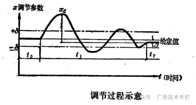 在自动调节系统中,当由于扰动使调节对象的平衡状态被破坏时,经调节作用使调节对象过渡到新的平衡状态。从一个旧的平衡状态转入一个新的平衡状态所经历的过程,叫做过渡过程,如图。这段时间内。当时间在t0以前,调节参数等于给定值,调节对象处于平衡状态。在t0末突然受扰动,平衡被破坏,调节参数x开始升高,逐渐达到最大值xd,由于调节器的调节作用,x开始返向给定值,但是调节参数不能一下子就平息下来,经过两次反复后,最后达到新的平衡状态。这时调节参数与给定值之差为Δ。